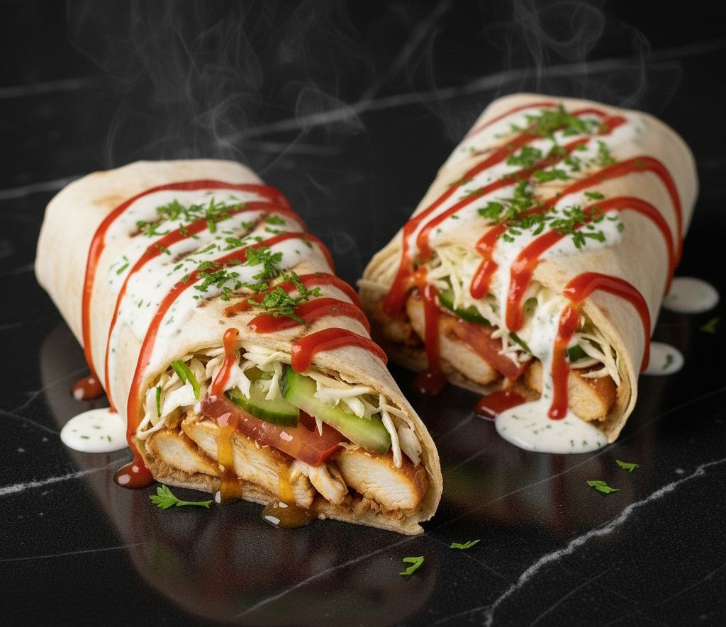 Классическая шаурма из сочной курочки на мангале, белокачанной капусты, ломтики томата и огурчика в четырех вочхитительных соусах : деми гласс, чесночный, томатный и гриль тейсти.