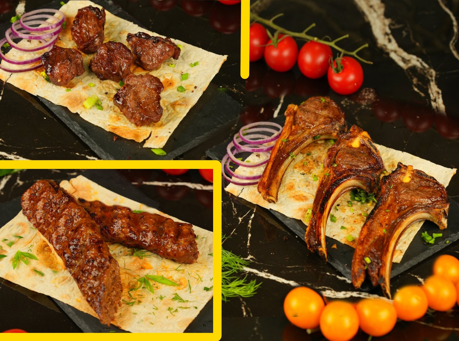Баранина (мякоть) Eco филейная бедренная часть без жил (используем только охлажденное мясо с Северного Кавказа), корейка баранья Eco Высокогорья Дагестана, люля- кебаб из мякоти ягненка (Дагестанский). Подаем на лаваше с луком. Сочное вкусное и нежное.